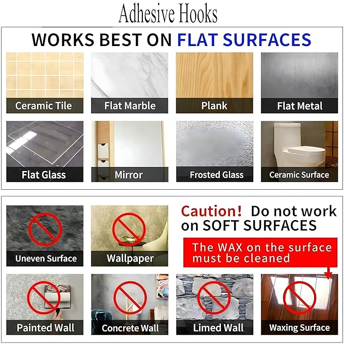 - Surface Compatibility: Ensure a secure fit by applying these wall hooks are to smooth, non-porous surfaces like glass, tile, metal, and wood. Please note that they are not suitable for painted walls, as they may cause the paint to peel off. Remember to wipe and prep the surface before use for optimal adhesion
