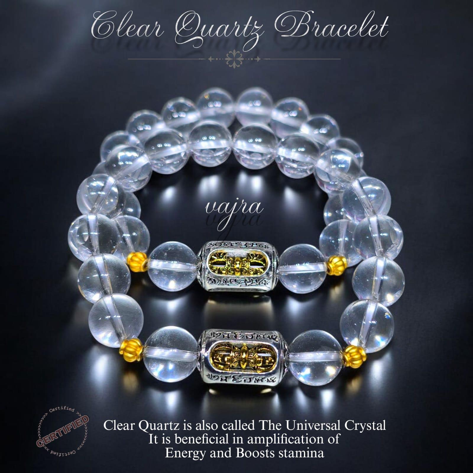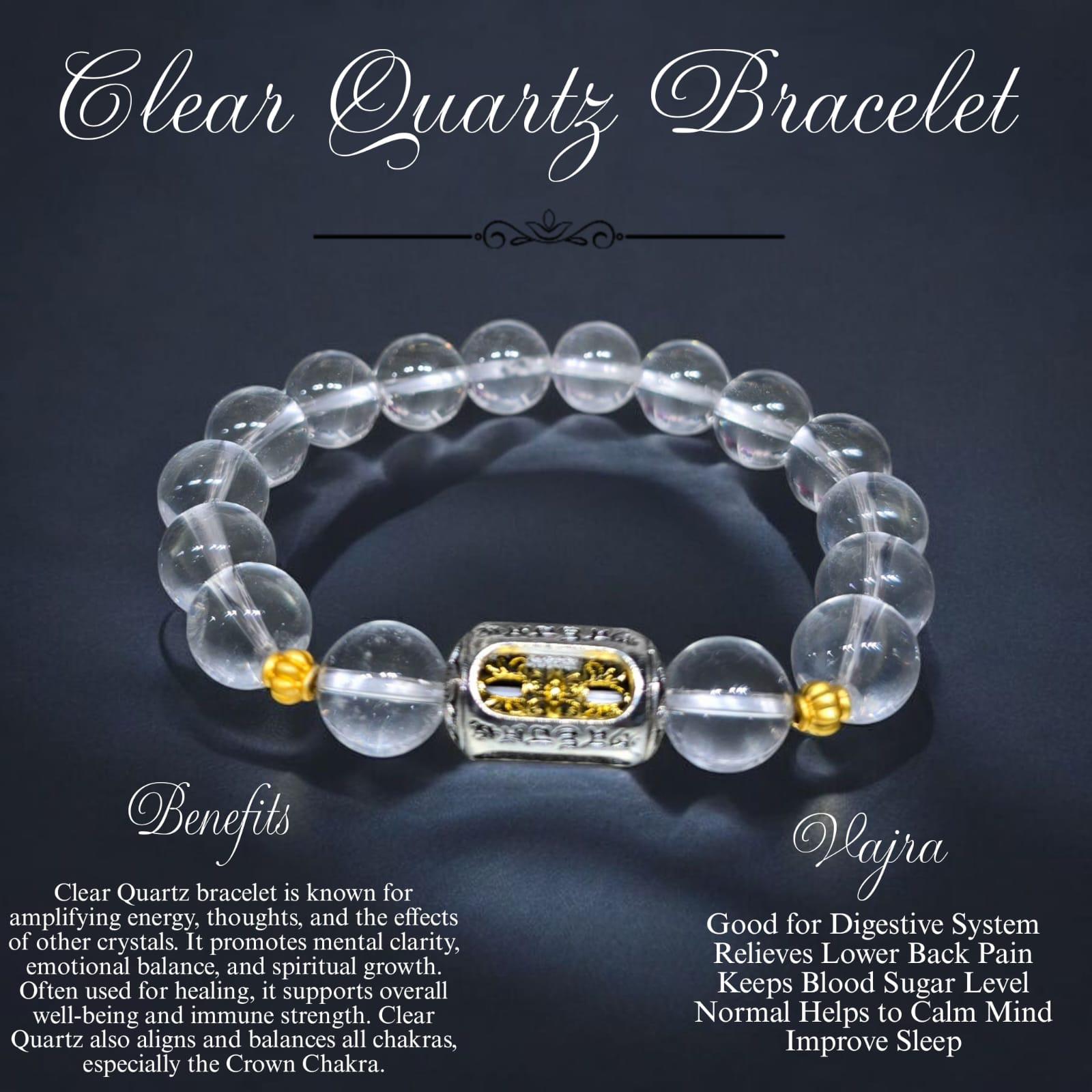 Embrace clarity and harmony with this elegant Clear Quartz Bracelet, beautifully adorned with a striking central Vajra charm and golden bead accents. Each bead is expertly crafted from high-quality clear quartz, renowned for its pure, luminous transparency and natural beauty.